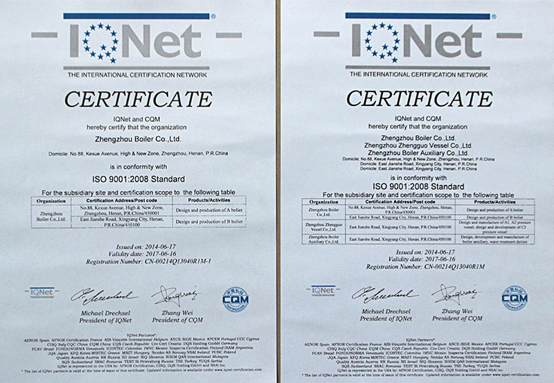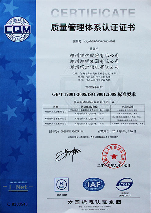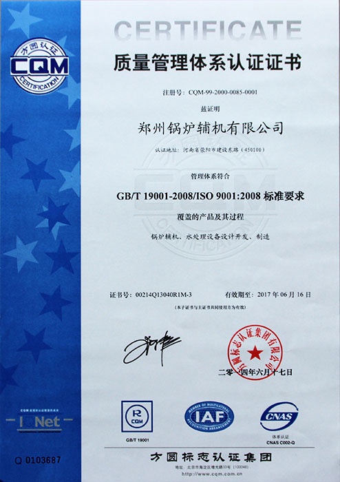 公司于1999年一次通過ISO9001國際質(zhì)量體系認證,2002年取得國際認證聯(lián)盟質(zhì)量管理認證證書,2008年一次通過美國機械工程師協(xié)會鍋爐及壓力容器ASME認證等。